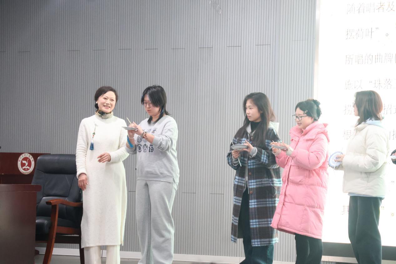 面对大学生如何接棒传承的提问,沈老师给出独到见解:“方言是清曲的根,建议同学们先了解扬州话的韵律之美。但传承不能止步于模仿。”她鼓励青年学子大胆创新,“可以在表演中融入现代舞蹈元素,用年轻人喜闻乐见的方式焕活古老艺术”。李伟莹同学颇有感触地说:“作为北方人,第一次接触扬州清曲就被清丽的唱腔震撼了,虽然方言不同,但那种江南水乡的婉转韵律直抵人心。沈老师现场创新的教学方式让我耳目一新,瓦碟敲击的清脆声响仿佛把扬州月色带到了眼前。”
