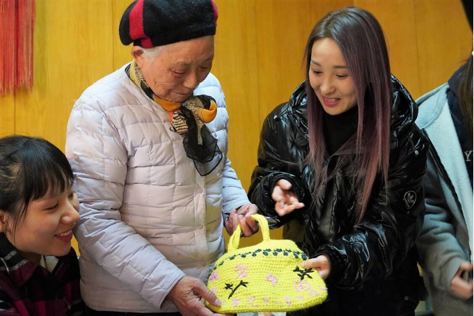 吴文清奶奶与我们展示她绣的织品