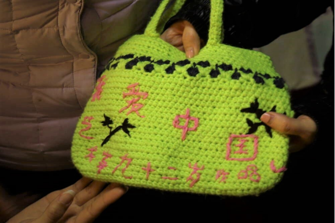 一只被吴文清奶奶珍藏的、绣有“我爱中国”字样的毛线包