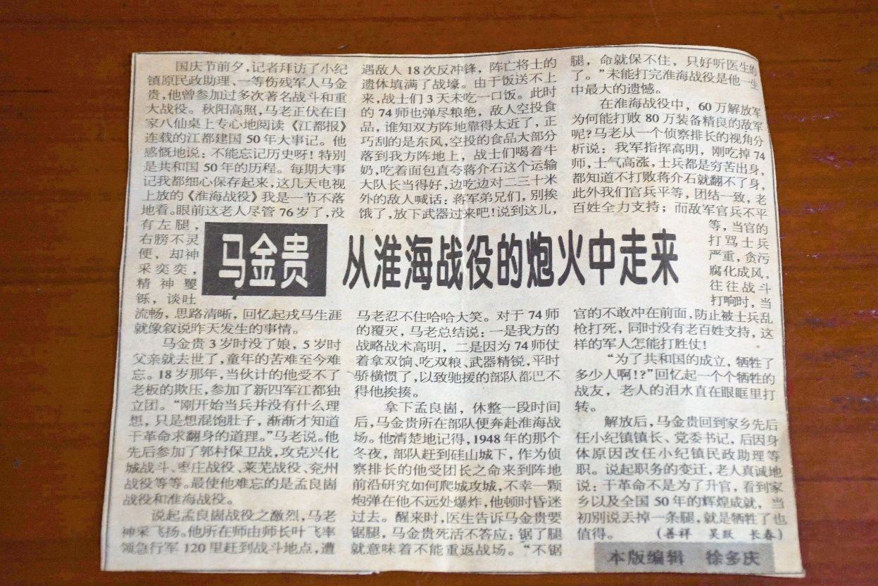 马金贵,1924年出生,1943年入伍,同年4月加入中国共产党,参加过数次战役,曾获多次二等功、三等功。在淮海战役中,抗战老兵马金贵的左腿不幸被炮弹打伤,被迫退出抗战一线,但他依旧对生命、对党、对国家充满热爱,并不断学习充实自己,奉献余生力量。