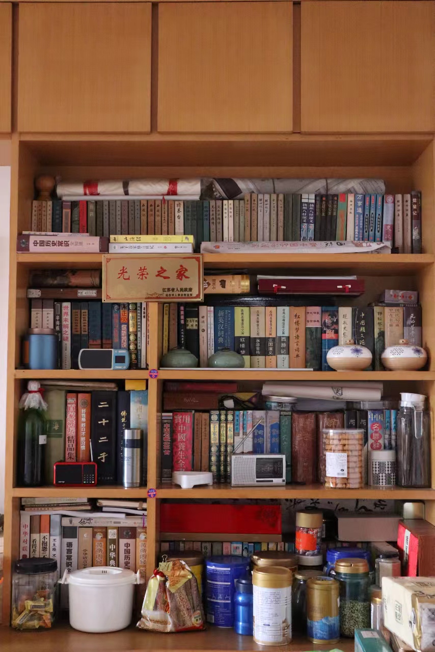 成积善老人的书架与荣誉展览柜