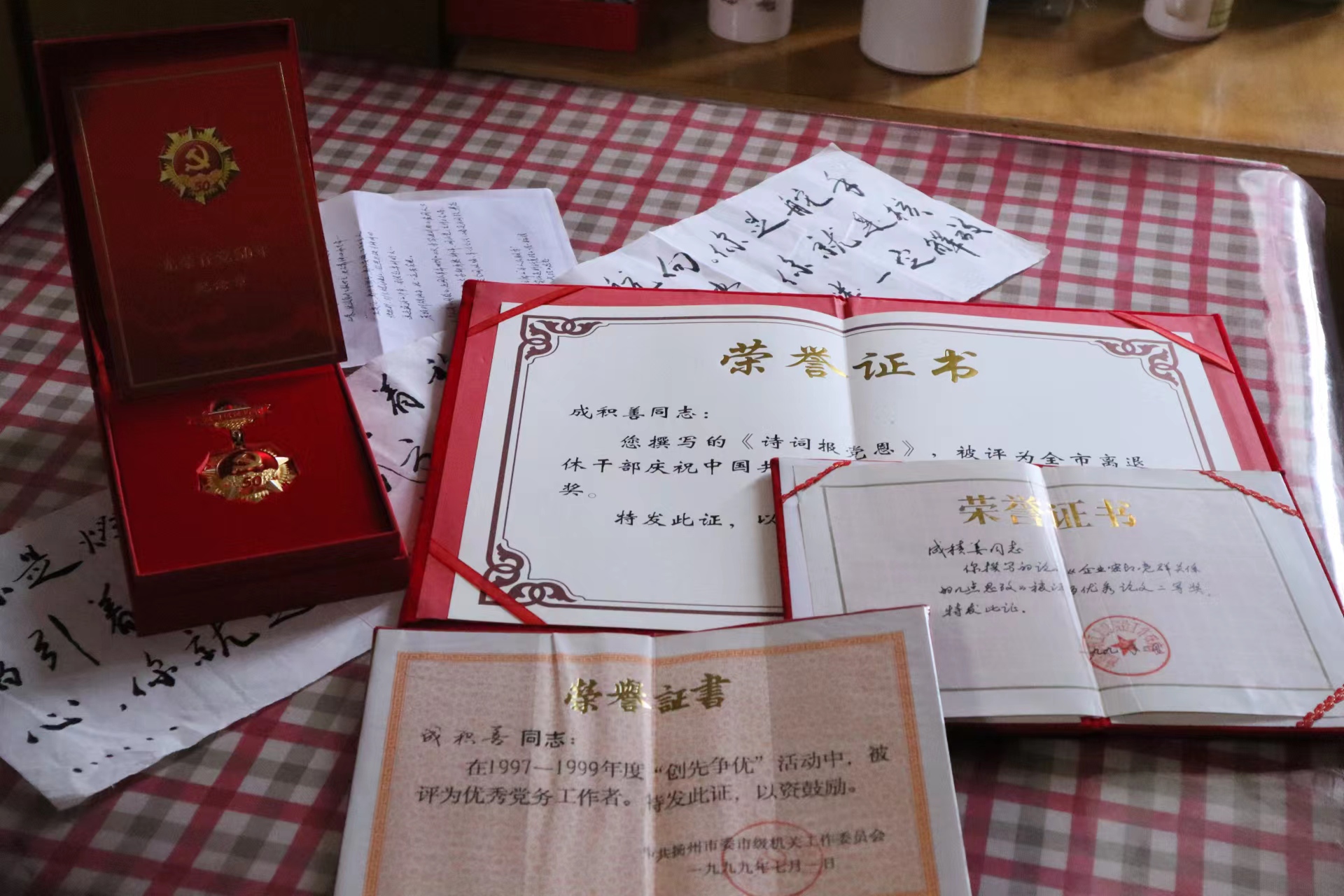 成积善老人的荣誉证书展示