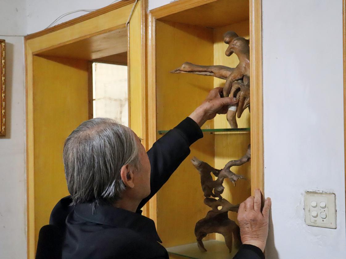 韩贤臣老人展示着雕根作品“骑鹤游天涯”