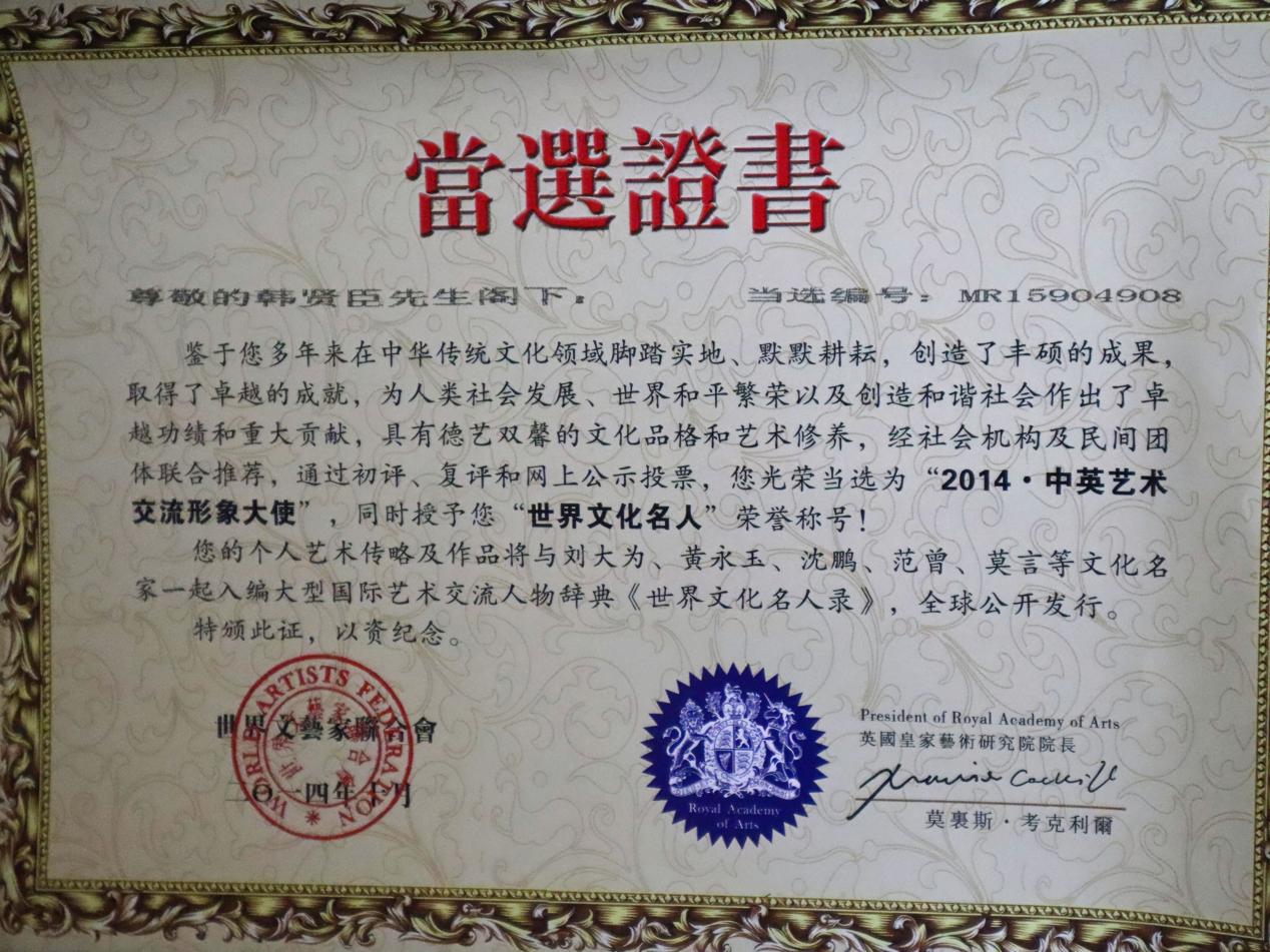 被评为世界文化名人时授予的证书