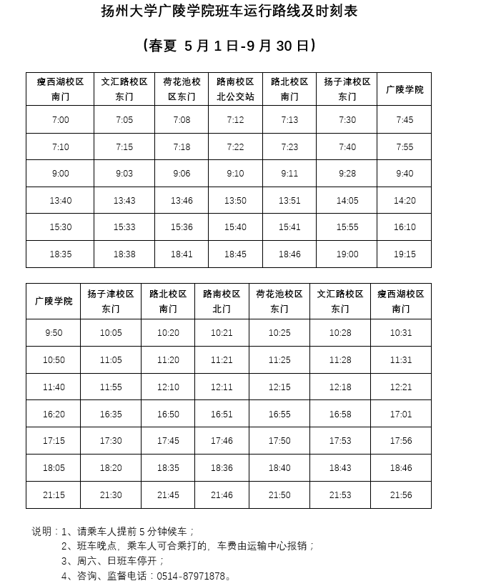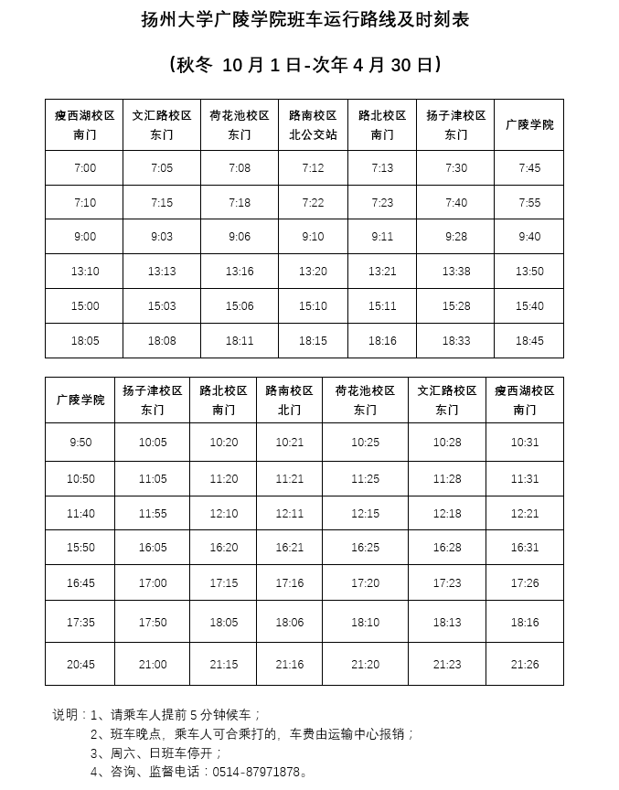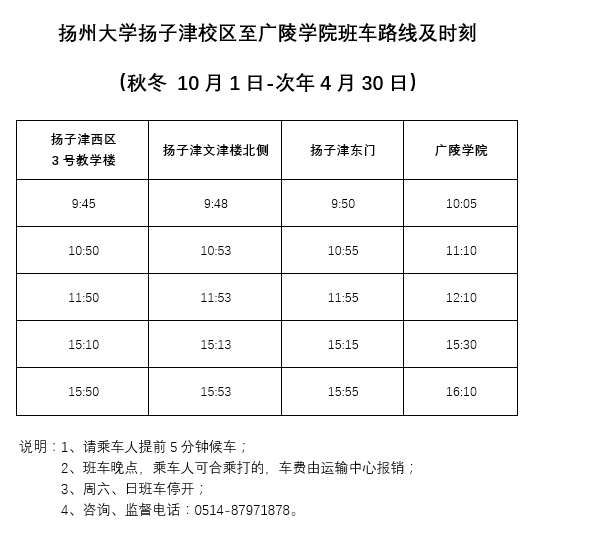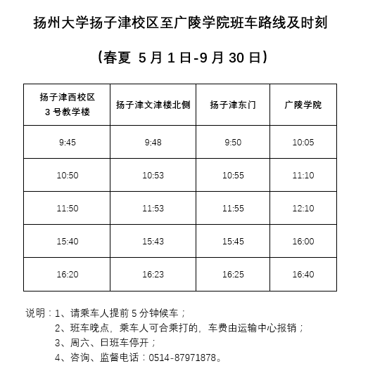 扬州大学广陵学院班车运行路线及时刻表