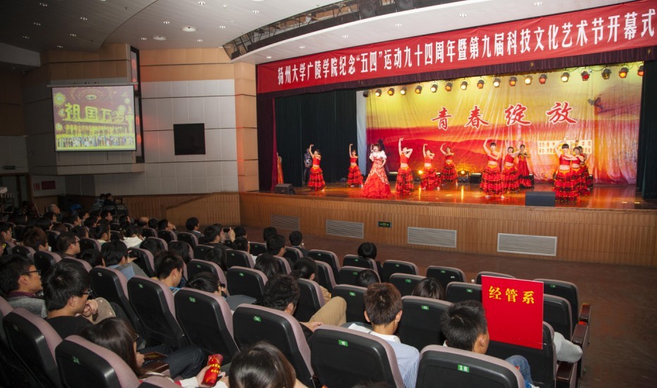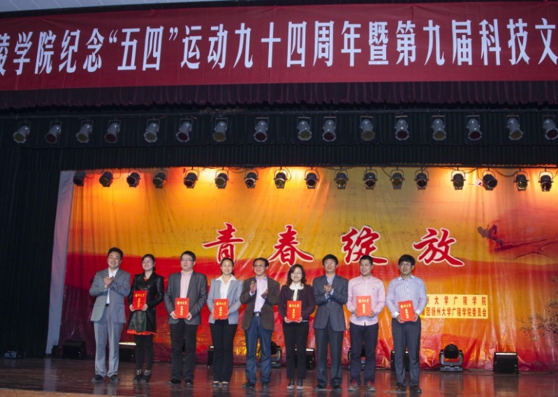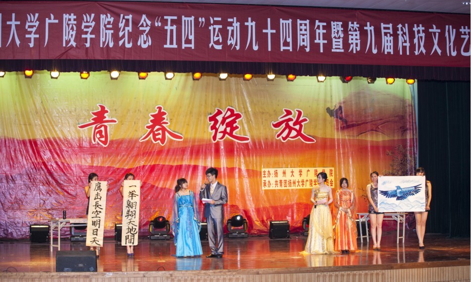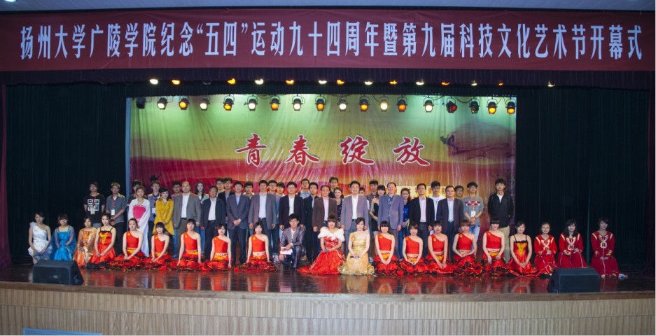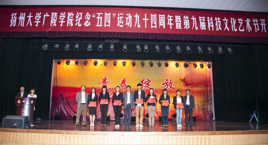 为纪念五四运动94周年、中国共产主义青年团成立91周年,引导广大青年团员传承和弘扬“五四”精神,激励广大团员践行中国梦,展现广陵学院当代大学生风采。5月7日晚,我院纪念‘五四’运动94周年暨第九届科技文化艺术节开幕式文艺晚会在中心校区小剧场隆重举行。校党委副书记、副校长芮鸿岩老师,校党委宣传部部长薛小平老师,校学生工作部部长张信华老师,校团委书记费坚老师应邀出席活动。我院全体院领导、各部门负责人、各系分管学生工作的党总支书记、主任、系学工办主任、团总支书记、获奖的教师同学以及500名学生代表参加了活动。