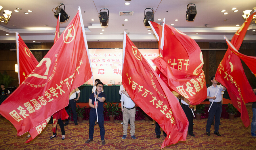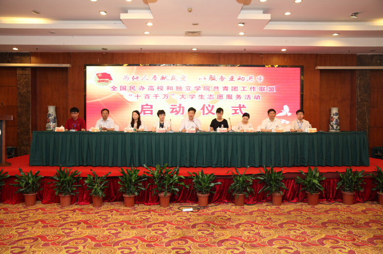 “作为一名光荣的志愿者,我承诺,在全国民办高校和独立学院共青团工作联盟‘十百千万’大学生志愿服务活动中,以‘为他人奉献友爱、以服务互助进步’为主题,尽己所能,甘心奉献,帮助他人,服务社会,践行志愿精神……”5月29日上午,百位身着红色志愿服的同学对着飘扬的志愿者旗帜声情高涨喊出了宣誓词。全国民办高校和独立学院共青团工作联盟“十百千万”大学生志愿服务活动集中启动仪式在扬州大学广陵学院举行。团中央学校部大学处副处长任博远同志,江苏团省委学校部部长陈文娟同志,校党委副书记、副校长叶柏森同志,扬州团市委副书记袁慧中同志,院长陈晓明同志、院党委副书记陈俊同志,来自全国13个省、直辖市的40余所民办高校和独立学院共青团工作联盟成员单位的共青团工作主要负责人、扬州大学广陵学院全体辅导员老师和100名大学生志愿者代表参加了此活动。