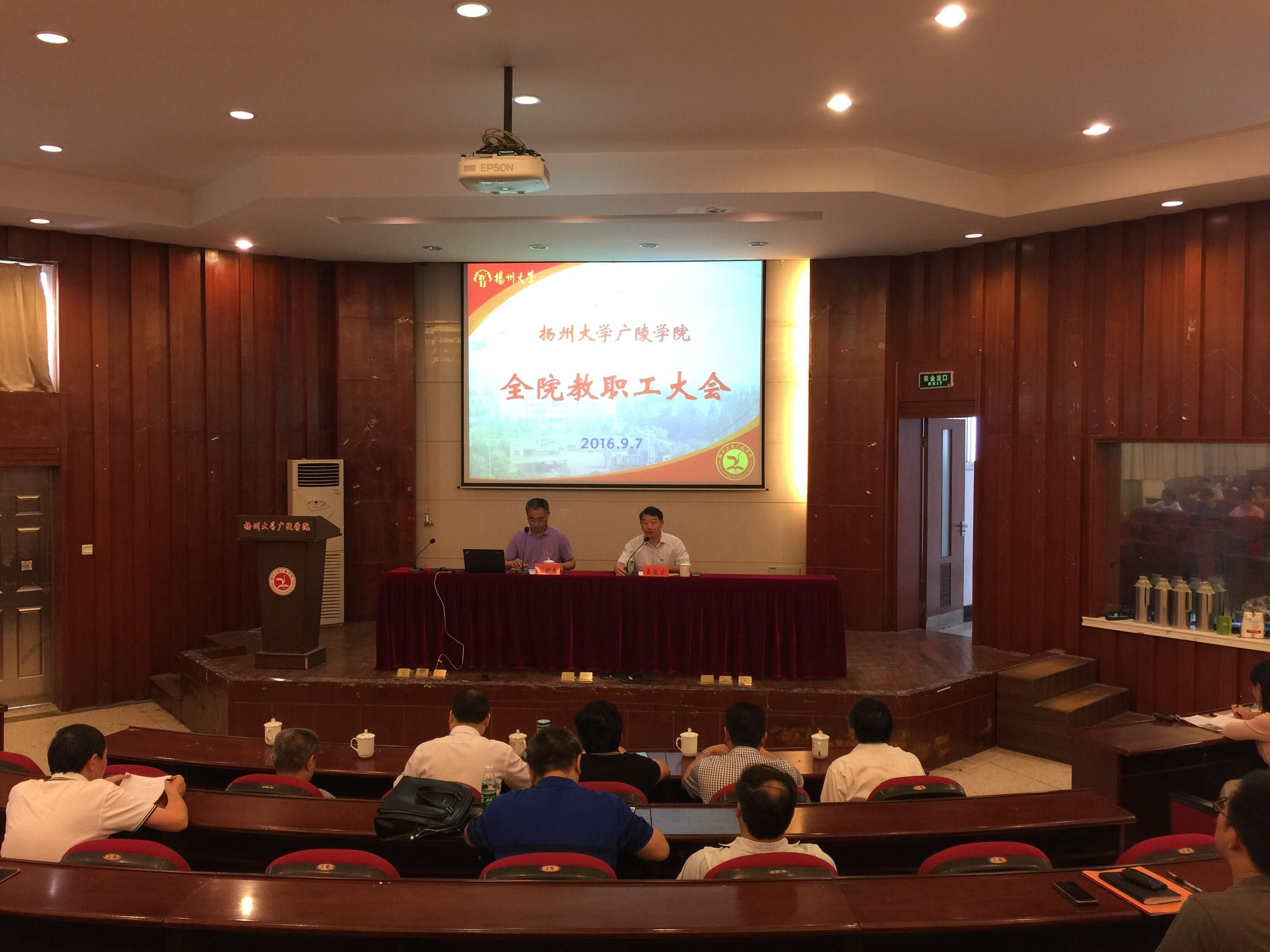 9月7日下午,广陵学院在行政楼一楼报告厅召开新学期全体教职工大会。大会由院党委常务副书记孟益宏主持。院长殷新春作了《认真谋划综合改革扎实推进内涵建设》的报告。全体教职工参加会议并聆听了报告。