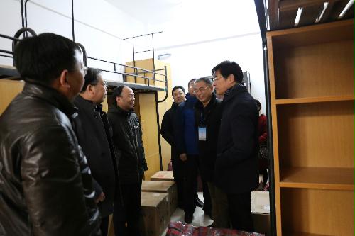校领导一行先来到文体馆的搬迁指挥中心慰问了新校区承建方、施工方和我院相关工作人员代表,听取了我院关于搬迁工作的专题汇报。随后到学生公寓,亲切慰问了公寓值班人员和安保人员,并参观了学生宿舍,检查了公寓搬迁情况。