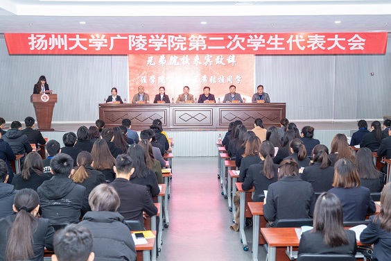 校学生会副主席周静、兄弟学院代表法学院学生会主席张桢对我院第二次学生代表大会的召开表示热烈祝贺。我院学生会主席刘家伶代表第一届学生会委员会作工作报告。会议审议并通过了学生会第一届委员会工作报告,选举产生了新一届学生会主席团成员,通过了第二次学生代表大会常任代表名单和修订后的《扬州大学广陵学院学生会章程》,并向全院同学发出了倡议。