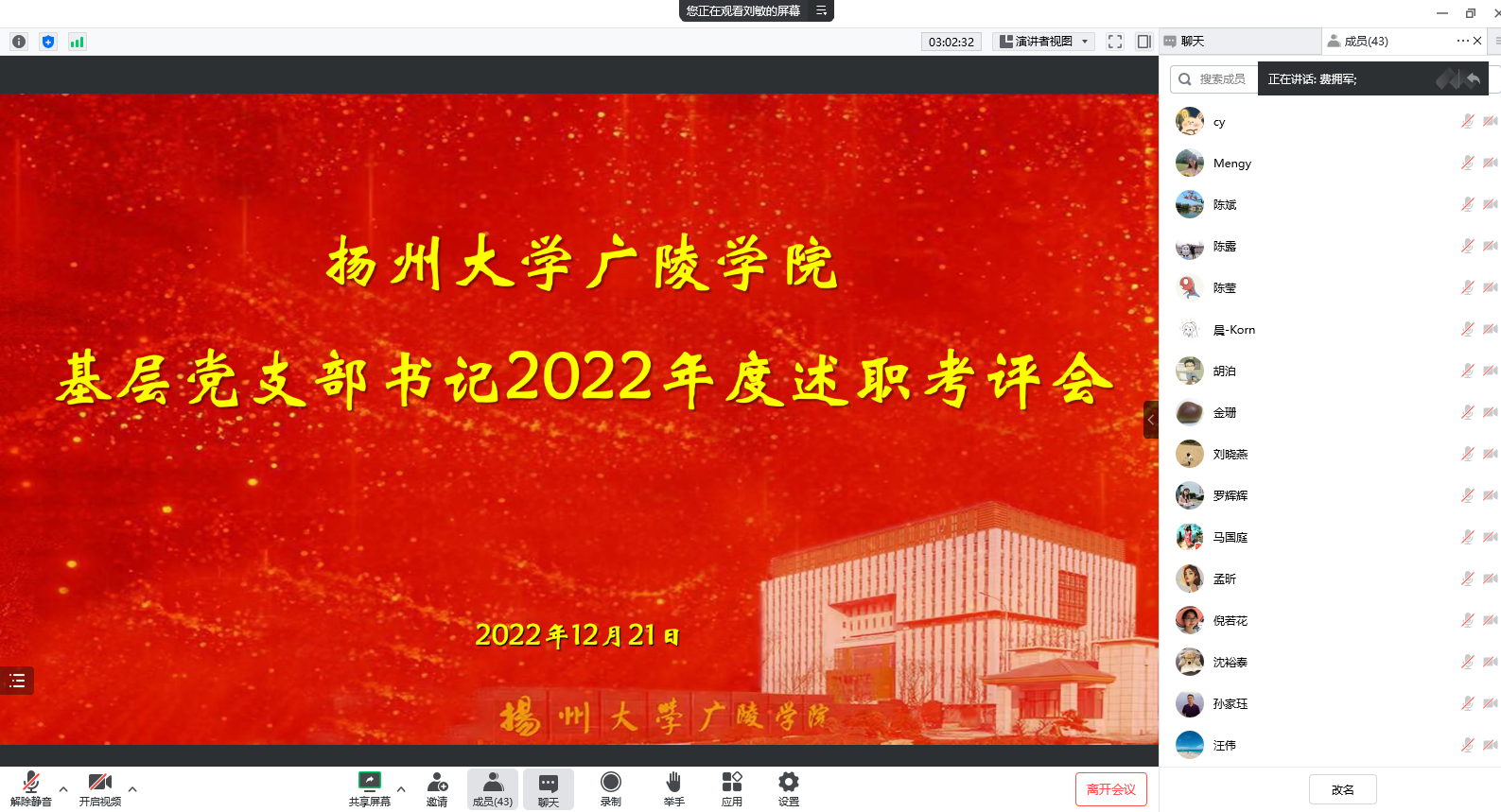 12月21日下午,广陵学院党委在线上召开基层党支部2022年度述职考评会,院党委书记吴荣军主持会议。