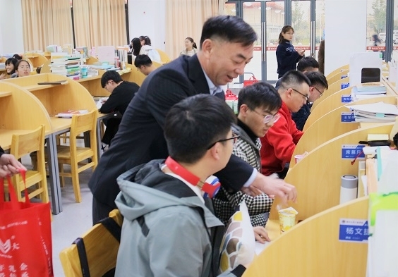 为了鼓励考研同学积极迎考,增强考研信心,舒缓备考压力,11月21日下午,院党委书记凌云志、党委副书记虞强等一行携考研慰问品走访图书馆、教学楼等考研教室,为1552名考研学子送上温馨的祝福和鼓励。