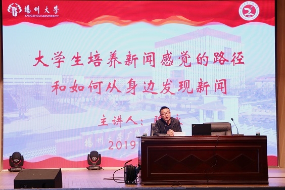 开班仪式后,《扬子晚报》扬州记者站站长陈咏以“大学生培养新闻感觉的路径和如何从身边发现新闻”为题,结合多年来从事新闻宣传工作的经验与具体的新闻案例,系统地为学员们阐述了新闻定义、新闻价值、新闻结构以及如何发现身边的新闻等内容。他鼓励学员们要热爱学习,以培养敏锐的新闻感知力;要多关心国内外时事、当下热点,以迅速发现身边新闻;要分清常态和非常态,找准新闻点;要学会联想、拓宽思路,以培养逆向思维。同时,他也希望学员们能够真正做到多读、多思、多琢磨、多开口、多动笔、多交朋以提升新闻写作能力。