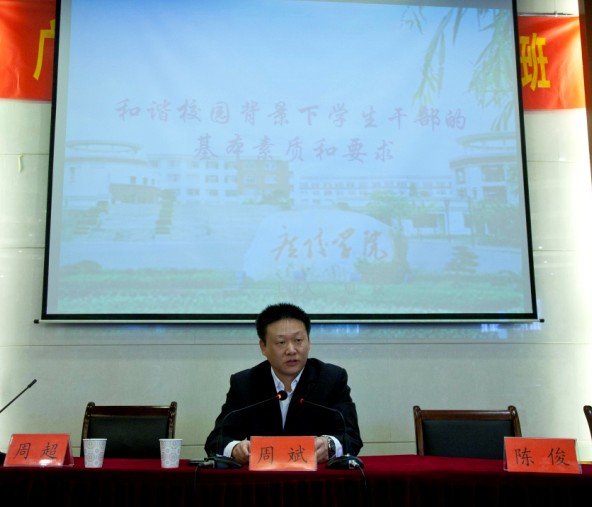 开班典礼结束后,开始了本期培训班的第一讲。周斌部长以“和谐校园背景下学生干部的基本素质和要求”为课题,讲述了加强学生干部队伍建设的注意事项。他建议同学们学会培养自身号召力、处事应变力以及个人特长。并提出学生干部六大关键词:定位、职能、素质、意识、能力、关系,指出学生干部务必抓好学习,服务同学。最后周部长强调,学生干部要反对“形式主义”和“功利主义”两种倾向,早日成为校园模范的主流影响力。