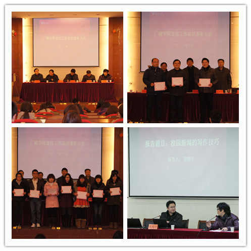 大会共分为四个议程。首先,院党委副书记陈俊总结了2011年我院对外宣传工作情况,肯定了2011年外宣取得成绩,强调了宣传工作“保质保量”的重要性。在院学工办主任、团委书记周超宣读了关于我院2011年对外宣传先进个人的表彰决定后,各位领导对蒋茜茜等11名优秀代表进行颁奖。