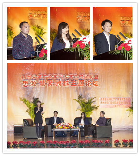 本次论坛以“思源、汇聚、跨越”为主题,以青年人的视角全面解析大学生村官在校成长经历,投身新农村建设,带领村名共同致富的青春故事。邀请了我院三位大学生村官联盟理事会成员担任嘉宾。江都市武坚镇镇团委副书记、周西社区党支部书记、江都市里下河农副产品商贸行总经理唐勇圣作了题为“忆往昔校园岁月,看今朝创业之程”的报告。他指出,作为一名大学生村官,应当耐得住寂寞、开得动脑筋、忍得住清贫、放得开胆子,他诙谐幽默的演讲赢得了场下同学的热烈掌声。随后,由南通市通州区骑岸镇岸西村大学生村官王敏也上台发言,以自己的亲身经历为例,讲述了“下基层”的甜苦滋味。最后,金坛市政协委员、金坛市直溪镇溪滨村主任助理、金坛市溪滨村大学生村官创业园经理陈学谦以“跟随、苦干、超越”为主题,向大家明确了“跟随、苦干、超越”这三个词的深层含义,并告诫同学们应当有一种吃苦耐劳、脚踏实地的精神。他们农村基层工作经历、青春故事博得现场同学的阵阵掌声。论坛上,他们三人还耐心地为现场提问的同学解答困惑。