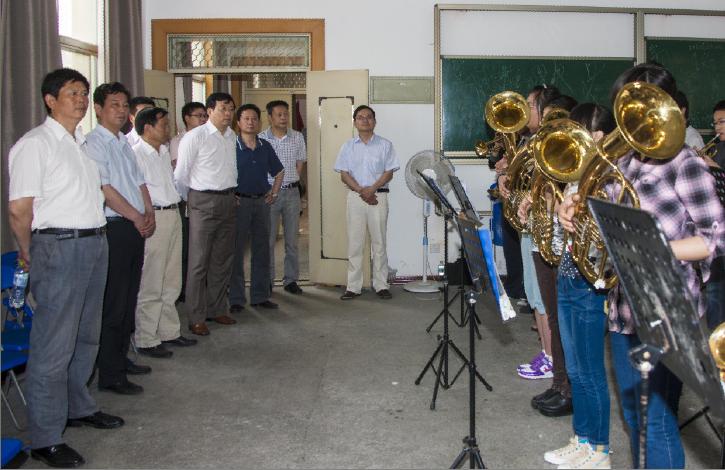 在排练现场,刘延庆书记等观看了我院团管乐队为迎校庆110周年而排练的四首曲目的表演。表演结束后,刘书记对铜管演出给予了充分的肯定和高度的赞扬,对铜管乐队近来取得的优秀成绩表示了肯定。同时,刘书记还向同学们简单的介绍了此次校庆活动的安排,他希望同学们能够克服困难加紧排练,注意饮食保重身体,再接再厉,为迎接我校110周年校庆鼓足干劲,提高乐队整体水平,为校庆献上高质量的精彩表演,展现扬州大学独有的艺术魅力。在离开排练现场时,刘书记希望学院做好铜管乐队的后勤工作确保校庆期间表演的正常有序。