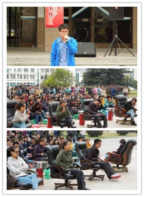 11月3日下午,由我院团委主办,院学生会承办的“广陵好声音”(复赛)在路北校区19号楼前进行。此次比赛邀请了“广陵歌后”王莉、“广陵小清新”王伟韬、艺术团前团长郝妍以及FM.Young音乐社社长李烨这四位“导师”。