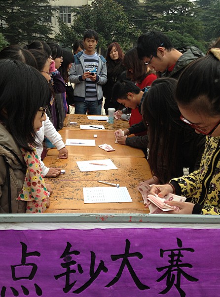 11月16日中午,我院经管系在江阳路北校区19号楼前举办了第四届点钞大赛,200多位经管系的同学参加了此次比赛。