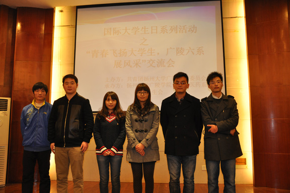 所谓众人拾柴火焰高,不论是对我们广陵六系还是对全体大学生而言,团结真的是股很强大的力量。而设立“国际大学生日”这一节日是为了控诉暴徒血腥的罪恶行径,为了纪念反法西斯的大学生运动,为了在大学生中倡导和平、民主和进步。化工与医药系学生会于11月18日在路南报告厅举办大学生日系列活动之五——“青春飞扬大学生 广陵六系展风采”的交流会。莅临本次交流会的嘉宾有:文法系学生会副主席周寿猛,经济管理系学生会主席罗国辉,机械电子系学生会主席洪剑,土电系学生会主席吉宇,化工与医药系学生会主席鲁云芬以及旅游与艺术系学生会主席李铭杰。
