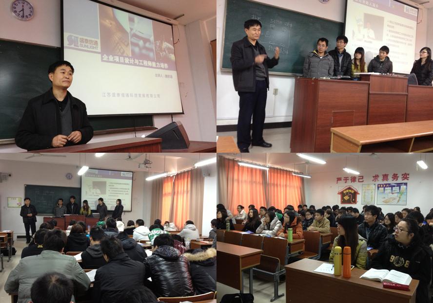 11月27日上午,受我院机电系邀请,江苏盛泰信通科技发展有限公司唐修连总经理等公司负责人给电信通信毕业班同学做了“企业项目设计与工程能力培养”及“企业毕业设计”的报告。唐修连总经理告诫毕业班的同学们要将学校学到的理论知识与企业注重的实践技能有机地结合在一起,在企业项目设计、实习中,尽快地完成从学校到企业的角色转变,遵循企业制度与企业产品设计的规范、流程,利用企业项目设计、实习,提高工程实践能力,缩短与实际工作的距离,为就业、择业,为从事产品技术研发工作奠定良好的基础。唐总介绍了盛泰公司“敏捷开发项目运作”的成功范例,强调企业项目设计的团队合作精神,鼓励同学们在电子通信类产品、民用中高端电子产品、电子系统集成与项目工程服务、软件外包服务、物联网应用等多项产品的研发上大胆探索,努力在社会企业的需求竞争中有用武之地。
