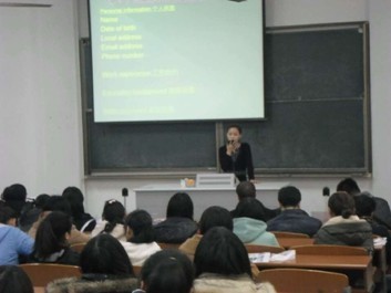 讲座开始,Susan老师向同学们讲授了职场实用英语与文化。她就英文简历、面试技巧、握手的艺术、外企文化等几个方面进行介绍,让同学们对外企应聘有了一定的认识。她说道:“英文简历由个人信息,工作经历,教育背景和其他技能组成。其中,个人信息包括name,date of birth,local address,email address,phone number几部分,信息内容要清晰简练。”在面试技巧的传授中,Susan老师指出了要注重着装的正式,回答问题时要掌握技巧。她用“被问及为什么要选择这家公司时,应该回答是为了使自己的工作能力得到更大的提升空间,而不能指责原来工作地的不好”的实例加强了同学们的理解。紧接着,外教Chris老师向同学们讲解了生活中的实用英语,使同学们对英语学习产生了更大的兴趣。