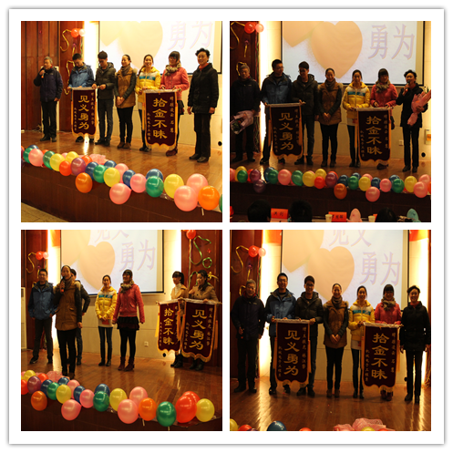经过激烈的角逐,由电信81201的潘登同学摘取了本次比赛的一等奖,通信81201 汪康宁与文秘81002樊梦云获得了二等奖,会计81101李姗姗、通信81201刘诗慧和测控81101王颖获得了本次比赛的三等奖。由我系花奇芹主任上台给一等奖获得者颁奖,六系主席分别给二等奖、三等奖、优秀奖获得者颁奖,然后我进行了晚会致辞,并感谢各位来宾的支持与工作人员的努力。最后环节表彰了王振虎、林江挚、顾凌云与石慧帮助我系老师抓住入室盗窃的小偷,并由我系高建和主任与姚蔚主任授予锦旗并进行总结发言。