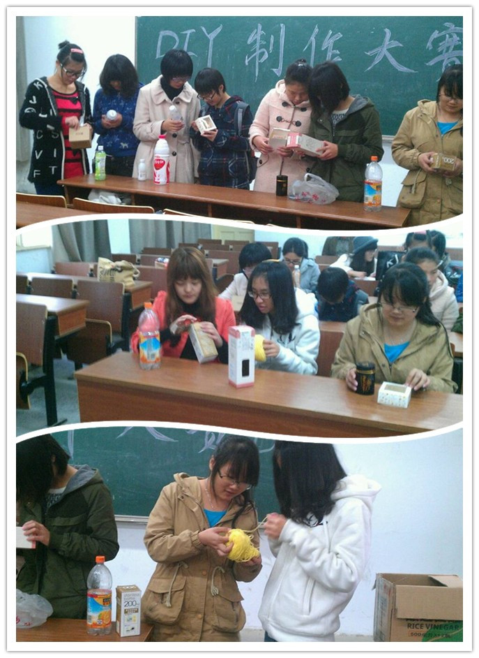 此次活动以丰富大学生课余文化生活,增强大学生的审美情趣,充分体现当代大学生的动手动脑能力,激发新时代大学生的创造力,提倡环保为背景,以大学生“爱手工,爱生活DIY”为主题,旨在让同学们在上课之余锻炼其想象创作能力,并提高其动手实践能力,丰富校园的文化气息,提高学生的文化素质,拓宽文化交流内容。比赛开始后,同学们拿起手边的毛线、塑料瓶、易拉罐、十字绣等材料,利用剪刀、彩笔等工具制作出专属于自己的作品。有的同学拿出针线灵巧地刺起了十字绣,10分钟不到,一幅印有小花图案的十字绣便呈现在大家面前;有的同学利用剪刀,将原本破旧的塑料瓶变成了美丽的花篮;还有的同学将废弃的硬纸板涂上颜色,制成了带有储物功能的收纳盒。最后,大家通过自己的双手,将看似无用的材料变身成一件件精美的手工艺品,赢得了观众的掌声。