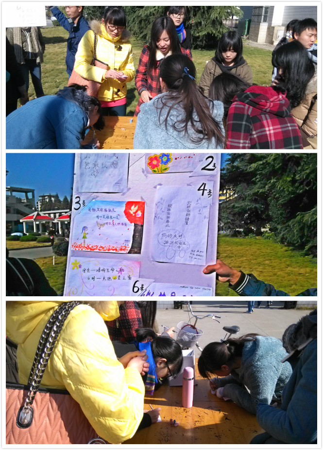 2013年11月29日中午,由广陵学院机电系团总支承办的“文明标语征集活动”在荷花池校区宿舍楼前火热开展。经过投稿海选,六位参赛选手的作品脱颖而出,吸引了众多同学前来为他们的作品投票,现场气氛火热。