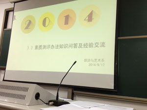 2014年9月17日晚上7点,由旅游与艺术系主办的学生素质测评办法知识问答及经验交流活动在路北5号楼419教室举行。活动旨在让同学们更深刻的了解素质测评评比细则,更好的指导班级的评奖评优工作,同时也作为新生入学教育的重要内容,成为系开学活动的重中之重。系学工办主任崔丽蓉老师、各班综合测评小组成员以及环艺、旅游班全体新生出席此次活动。