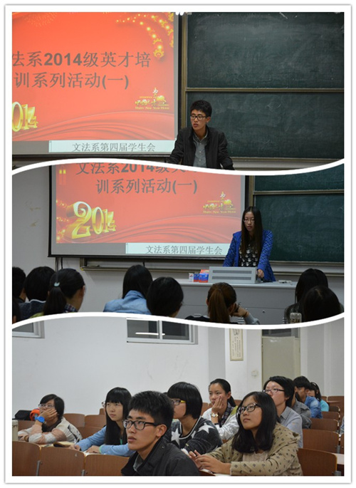 班长、团支书是一个班级的重要核心力量,在班级管理上发挥着至关重要的作用。为促进班干部的成长, 10月16日晚,文法系于25号楼203教室开展了第一次英才培训活动。此次培训主要针对14级新生班长及团支书,由学生会长副主席杨琪铭主持,由优秀班长团支书代表曹婕、王萌两位同学分别主讲。