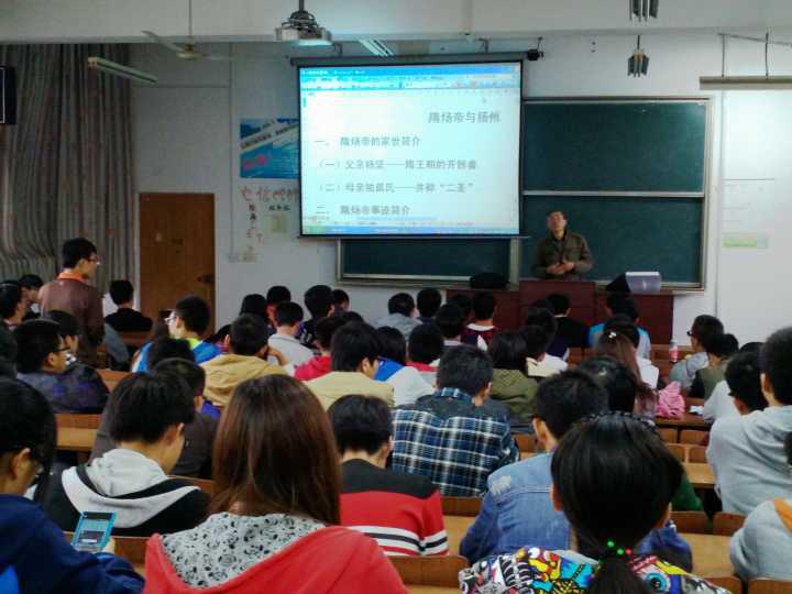 为了迎接扬州建城2500周年,生动再现扬州历史沧桑,使同学们了解扬州城的前世今生。2014年10月21日下午,土电系邀请了社会发展学院文史专家、关心下一代委员会宣传员张连生教授作为主讲人,在江阳路北校区5号楼221教室,面向新生们作了一场关于隋炀帝与扬州的讲座。