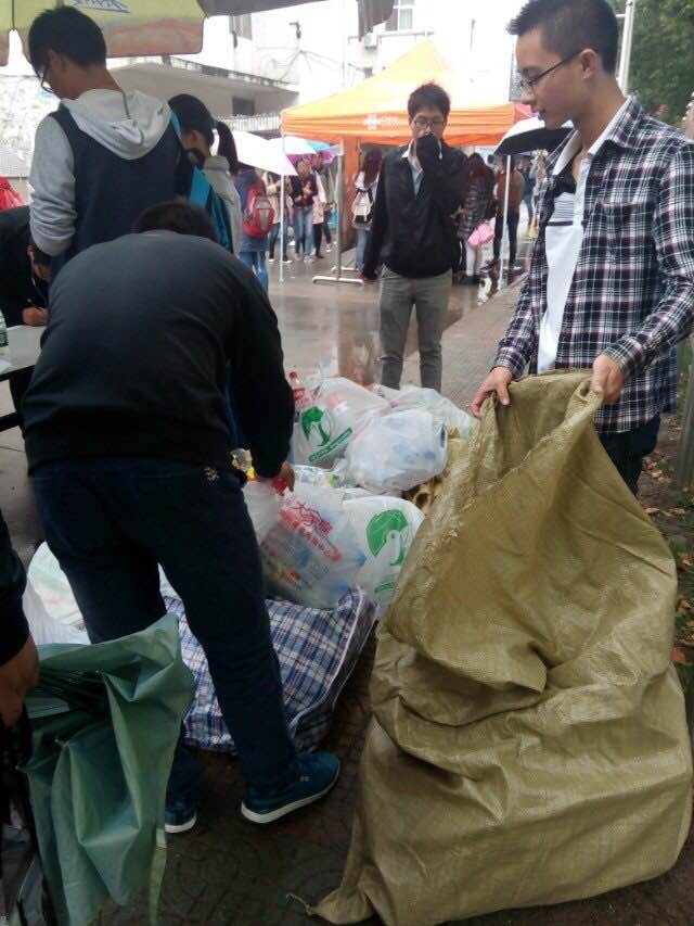 10月29日中午,我院阳光协会的文体部、项目部、秘书处联合在江阳路南校区女生宿舍楼下举办了一个“废旧瓶子献爱心”的公益活动,该活动由我院学生社团联合会主办。
