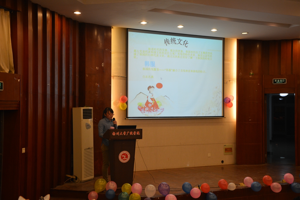 近几年来,韩国文化在我国得到了较快地发展,哈韩一族更是无处不在。为了让广大同学更多的了解韩国文化,加强中韩两国文化交流。10月31日晚上,我院木槿花下韩语文化社在路南水利报告厅举办了韩语文化讲座活动。