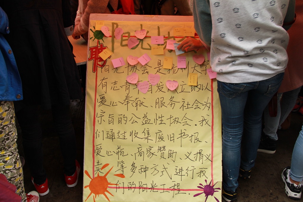 “以后吃多少就点多少的分量……”一张张便利贴,各种各样的字迹,寄语贴满了整个爱心墙。阳光协会的成员们还耐心地为同学讲解此次活动的意义以及各种勤俭节约的正确行为,为广大同学提供节俭的建议。