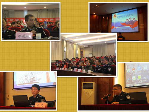 为了加强同学们的防范意识,保卫办与文法系于11月13日下午在水利报告厅联合开展了一场“警官进校园,安全系我心”的大学生防骗专题讲座。出席这次讲座的警方人员有扬子津派出所副所长、全国爱民模范宋国华,扬州市公安局开发区分局政治处副主任李志,扬子津开发分局治安大队教导员徐筱波,扬子津派出所教导员潘浩浦,社区民警毛迁。我院刘佩健副院长、保卫办顾国华主任、文法系团总支书记李闰月等老师也出席了本次活动。