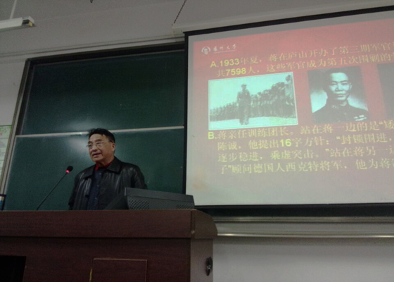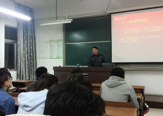 严老师首先详述了当时共产党、国民党的状况,长征开始的背景及原因。随后从四渡赤水、抢渡大渡河、飞夺泸定桥、翻雪山、过草地、挺进陕北、三军会师等方面详细讲述了红军长征的艰险历程,并分析了长征胜利的原因。此外,他还总结概括了长征精神及长征精神内涵,同时要求我们当代大学生不能忘本,要继承先辈们留下的精神遗产,任尔腐败资本风,坚信马列不放松。整场讲座思路严谨,历史脉络清晰,知识内容丰富,讲到激动之处,严老师更高唱《长征之歌》,赢得阵阵欢呼。