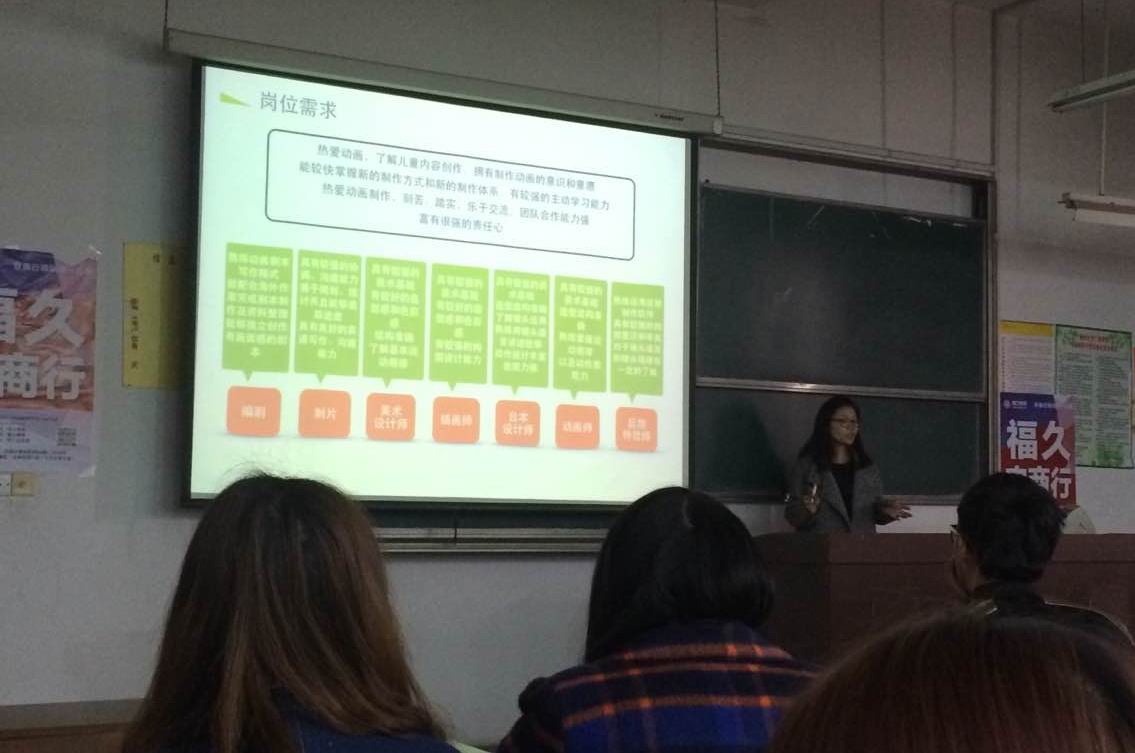 左袋文化传媒公司是一家精英化的创作型动漫公司,以“打造中国精品原创动漫”为己任,其原创作品《艾米》曾多次荣获国内外大奖。此次讲座邀请左袋文化传媒公司王超岳女士作为主讲人,她首先以PPT形式展示了左袋传媒的优秀作品,并详细介绍了左袋传媒的组成、作品制作过程以及公司所取得的成就。随后以左袋传媒为例,围绕当前动漫产业发展状况、动漫业人才需求等问题进行了深入讲解,并切合实际提出了一些建议和要求。风趣幽默的互动使现场气氛十分活跃,让同学对动漫产业有了全新的认识。