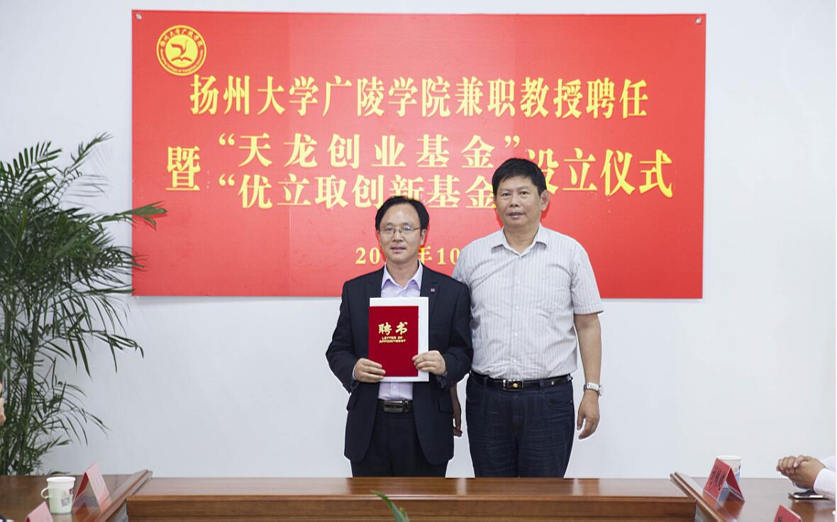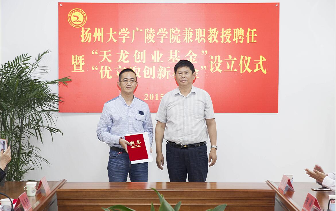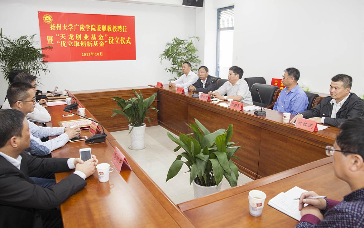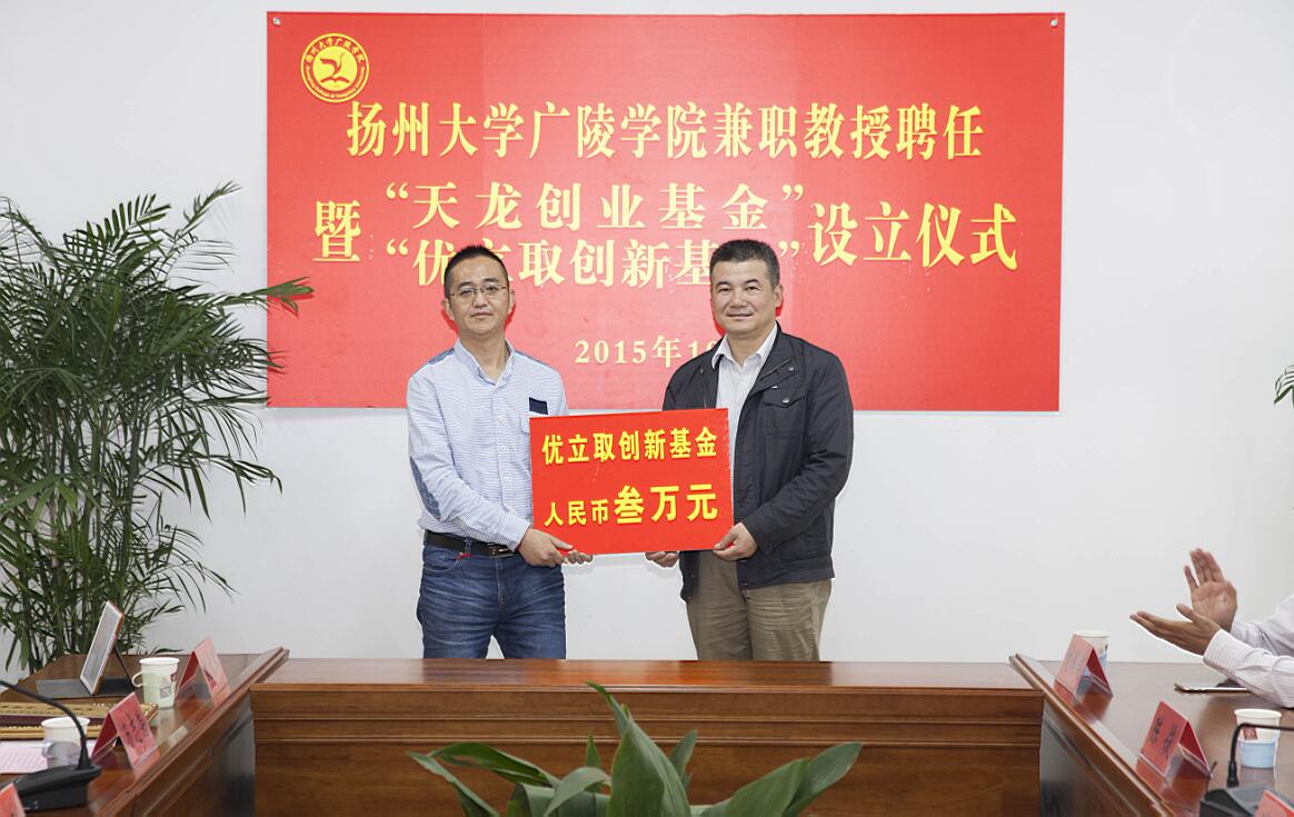 聘任仪式后,举行了“天龙创业基金”“优立取创新基金”设立仪式,基金的设立旨在增强校企合作,通过资助有良好创业前景的大学生项目,扎实做好创新创业服务工作,加强创新创业宣传教育,鼓励广大学生自主创业,提升就业质量。