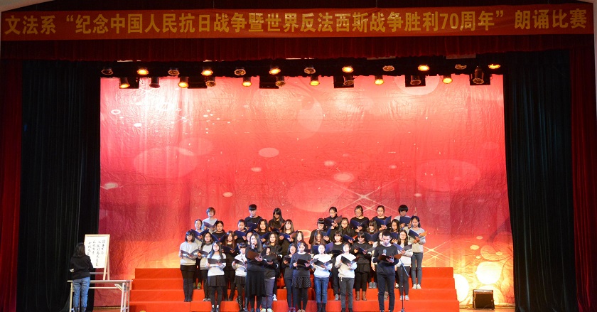 为了进一步加强爱国主义教育,弘扬抗战精神,值此抗战胜利70周年之际,广陵学院文法系举行的“纪念中国抗日战争胜利暨世界反法西斯战争胜利70周年”朗诵比赛于11月25日在文汇路校区大礼堂内圆满落幕。