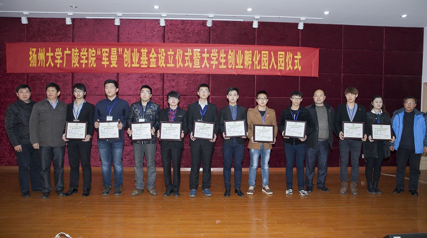 本次仪式由学院团委书记、学工办主任周超主持。周书记介绍了我院大学生创新创业工作开展情况以及大学生创业孵化园概况。陈俊副书记、陈金刚副院长、刘佩健副院长为文法系、机电系、旅艺系颁发“优胜杯”,陈晓明院长为土电系颁发“创青春杯”。随后,江苏军曼农业科技有限公司总经理鲁曼女士为学校捐赠创业暨助困基金,刘春秋副主任为鲁曼女士颁发捐赠证书及纪念奖牌。陈晓明院长与廖正军董事长共同为我院创新创业基金榜暨“众创空间”、“创客工作室”揭牌。揭牌仪式后,陈俊副书记代表学院与各项目负责人签订《扬州大学广陵学院大学生创业孵化园入园协议书》,全体院领导为创业团队负责人颁发校内创业实践许可证。
