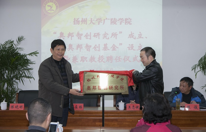 本次仪式由党委副书记陈俊主持。他对江苏奥邦投资控股集团以及杨在珏先生作了简要的介绍,随后,陈晓明院长为杨在珏董事长颁发了兼职教授聘书,并共同为“奥邦智创研究所”揭牌。学院希望通过兼职教授的聘任以及“奥邦智创研究所”的成立,能够加强与企业的交流和合作,为学生创新创业搭建新的平台,提升学院办学水平和办学层次。