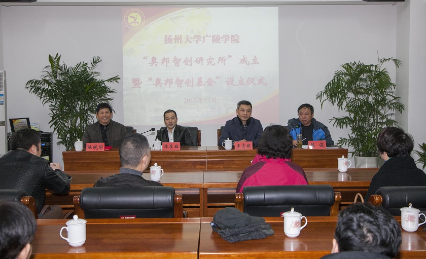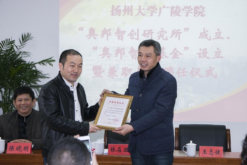 12月23日下午,我院在江阳路南校区办公楼419会议室举行了“奥邦智创研究所”成立、“奥邦智创基金”设立暨兼职教授聘任仪式。江苏奥邦投资控股集团有限公司董事长杨在珏,扬州大学对外联络办公室副主任王志健,我院院长陈晓明,院党委副书记陈俊,副院长刘佩健、陈金刚,江苏奥邦投资控股集团代表以及我院经济管理系全体教职工参加了此次会议。