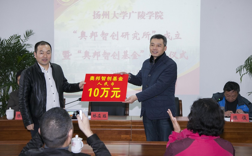 仪式上,江苏奥邦投资控股集团有限公司为学院捐赠10万元,设立“奥邦智创基金”,以保障“奥邦智创研究所”后期的正常运行。我校对外联络办公室副主任王志健为杨在珏董事长颁发了捐赠证书及纪念奖牌。