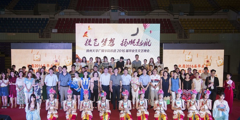 6月20日晚,我院欢送2016届毕业生文艺晚会在荷花池校区体育馆隆重举行。校党委书记姚冠新,校党委副书记、副校长叶柏森,副校长、广陵学院理事会理事长胡效亚,副校长洪涛,校长办公室主任、广陵学院理事缪昌武,校纪委副书记、监察处处长、广陵学院理事蔡宝刚,校教务处处长、广陵学院理事张清,校学生工作处处长、广陵学院理事张信华,校财务处处长、广陵学院理事华清君,校国有资产管理处处长、广陵学院理事耿一平,校长办公室副主任林刚,我院院长陈晓明,院党委书记殷新春,院党委副书记陈俊,副院长刘佩健,副院长陈金刚等领导莅临晚会,学院各部门、各系部负责人以及全体老师、毕业生和在校学生代表参加晚会。