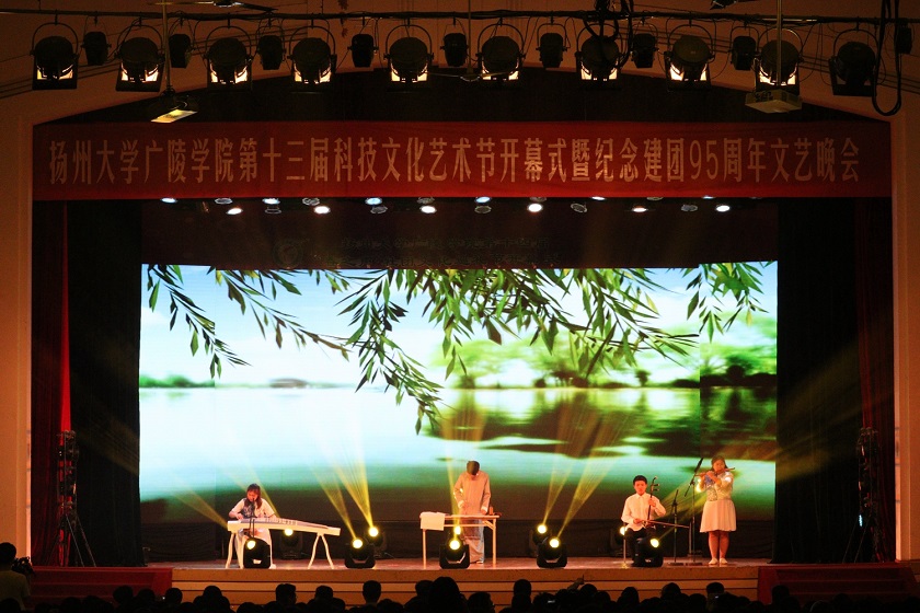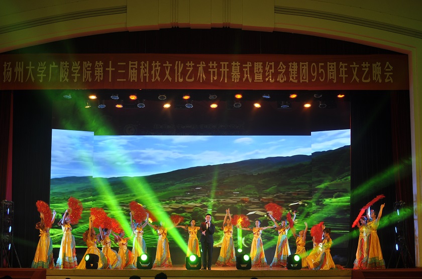 开幕式结束后,以“青春在奋斗在闪光”为主题的文艺晚会正式开始。此次晚会分为“扬帆广陵行”、“起舞冲霄汉”、“同铸青春梦”三个篇章。青春组曲、古典舞蹈、情景小品、器乐演奏等形式多样的节目为全体师生带来身体与心灵的双重享受。组曲《向快乐出发》轻松欢快,朝气蓬勃,展现出大学生的乐观积极的人生态度;蒙族群舞《向天歌》舞姿优美,动作流畅,似若一幅优美的“天鹅图”,将晚会推向了高潮;诗歌朗诵《写给未来的你》饱含着同学们对未来的期许,引起大家的强烈共鸣。