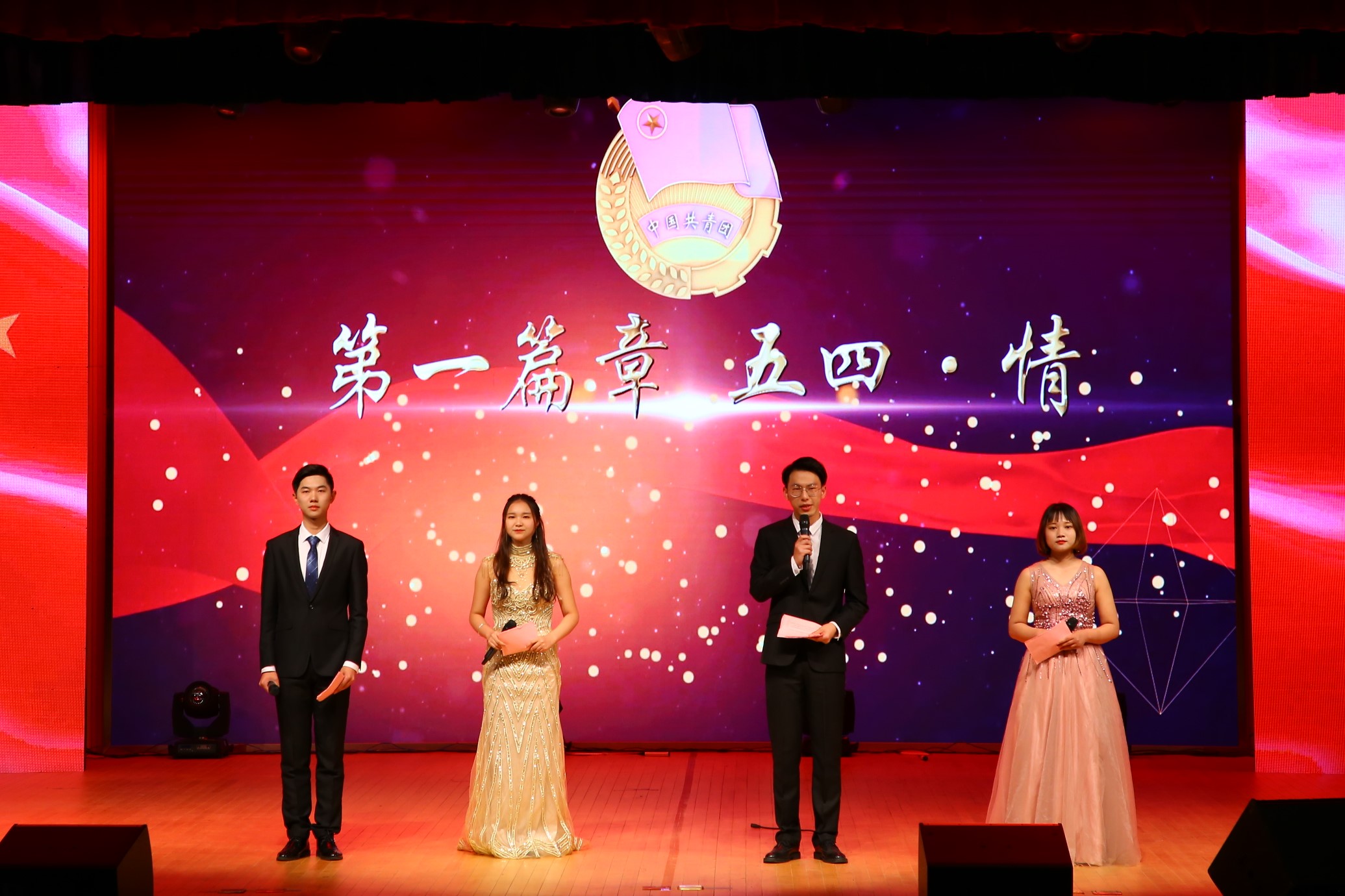 青春逐梦新时代”文艺晚会正式开始,共分为“五四”情、校园风、爱国梦三个篇章。青春快闪《我们都是追梦人》拉开了整场晚会的序幕。器乐诗歌《致·新青年》悠扬的器乐旋律搭配舒缓而动人的诗句,瞬间燃起了青年大学生高涨的情绪;青春组曲《天天向上》奏响当代大学生的青春旋律;歌舞《Dancing