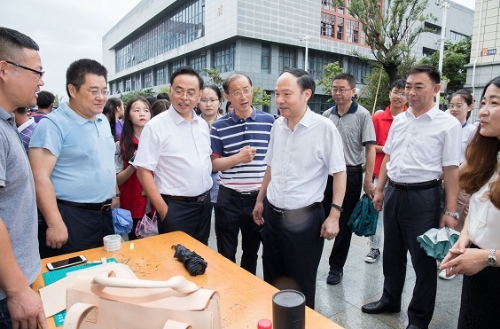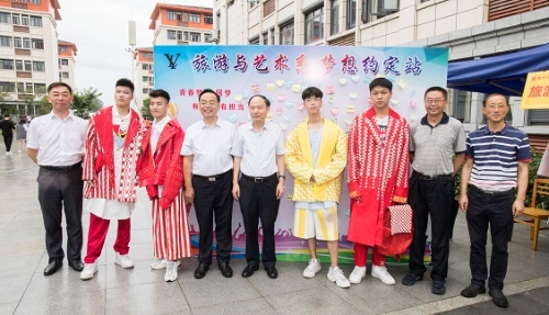 在迎新现场,焦新安、俞洪亮还饶有兴致地观摩了极具专业特色的智能车获奖作品演示以及服装皮具设计获奖作品等,并在“旅游与艺术系 梦想约定站”的签名墙前合影留念。