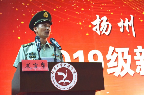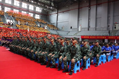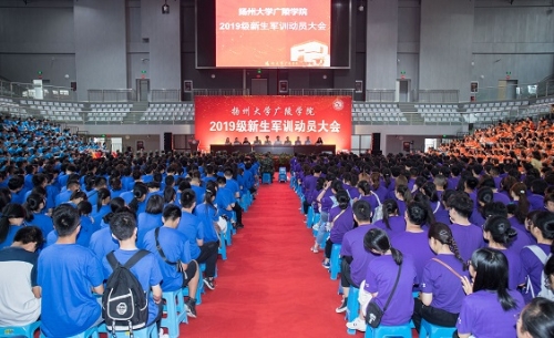 8月29日上午,我院2019级新生军训动员大会在文体馆召开,为期两周的军训正式拉开帷幕。院党委副书记虞强,中国人民武装警察部队扬州支队少校参谋雷聪聪,军训团政委、院人武办主任周宏伟,军训团副政委、院人武办副主任闫海水,各系党总支副书记出席大会。2700余名2019级新生在新生辅导员和班主任的带领下,参加动员大会。会议由闫海水主持。