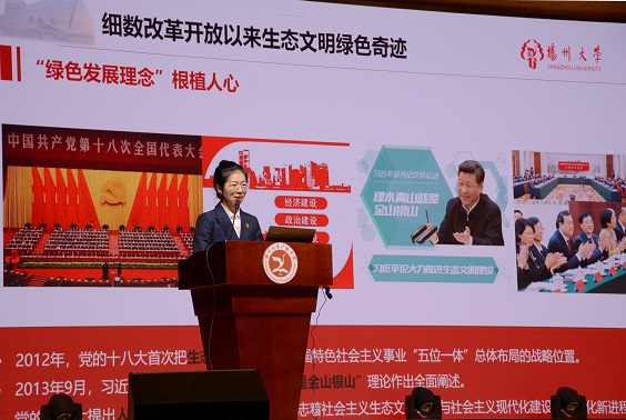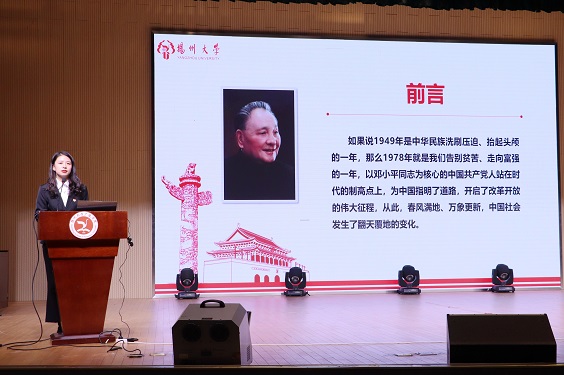 第二场“改革开放史”宣讲活动分别以经济、社会、文化和生态等四个方面为主题。来自新传学院的陈琨老师首先讲述了改革开放40多年来中国经济发展历史进程中取得的重大成就,勉励在场学生们“吾辈当自强,成为我国经济发展的中流砥柱”。“你是家庭第一代大学生吗?”“你为何能成为第一代大学生?”水利学院的汤薛艳老师以两个提问引出了有关社会教育的宣讲,引导师生们深思改革开放对于中国教育的影响。来自社发学院的肖薇老师则借用电影《姜子牙》精彩片段,对改革开放以来的文化建设展开了详细讲解,并表达了对师生们能够延续文脉,使历史与当代相得益彰的期望。最后,建工学院的王国静老师以两段生态纪录片作引,带领现场师生们细数了改革开放以来的生态文明绿色奇迹,从而深刻地认识中国用实践证明“绿水青山就是金山银山”的发展理念。
